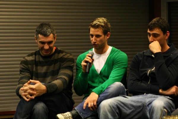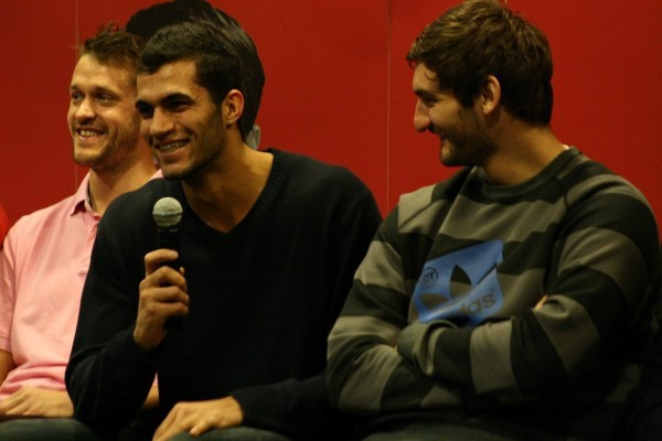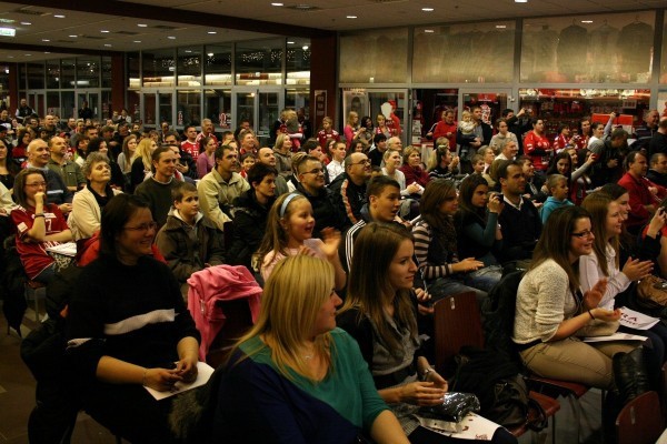 A játékosok frissen zuhanyorva érkeztek végül a színpadra, a közönség tapsvihara közepette. Egy órás szurkolói kérdez-felelek következett, amiben akadtak komoly kérdések és válaszok, bár majdnem mindenkinek volt anyanyelvi tolmácsa, a fiúk megpróbálkoztak magyarul is válaszolni. Iváncsik Tamás fejtette ki, miért mondta vissza a válogatottságot, de azért többségében voltak inkább azok a kérdések, amik könnyedebb témákat feszegettek. Fazekas Nándor elárulta, a csapattal szerveznek közös disznóvágást, Nagy László pedig bevallotta, hogy pár éve nem gondolta volna, hogy Magyarországon fog játszani, de most nagyon örül, hogy itt van.