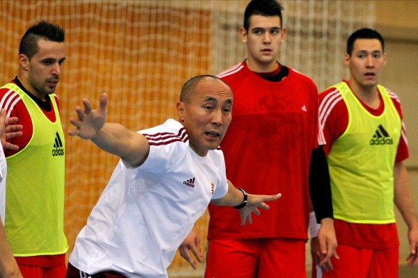 Talant Dujsebajev kirgiz származású edző, a magyar kézilabda-válogatott új szövetségi kapitánya a csapat edzésén a miskolci Generali Arénában. Mögötte Szöllősi Szabolcs, Bánhidi Bence és Schuch Timuzsin. (MTI Fotó: Vajda János)