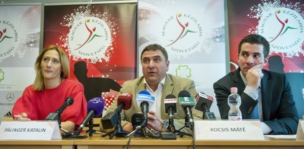 Pálinger Katalin, a szövetség női szakági alelnöke, Elek Gábor, a női kézilabda-válogatott szövetségi kapitánya és Kocsis Máté, az MKSZ elnöke, a Magyar Kézilabda Szövetség (MKSZ) sajtótájékoztatóján a fővárosi Módusz Irodaházban (MTI Fotó: Illyés Tibor)