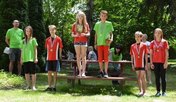 Teljes Veszprém megyei fölény született a középtávú versenyen a 14 éveseknél. A fotón - balról jobbra - Lantai Anna Boróka (2.), Gaál Csanád (2.), Bácskai Eszter (1.), Angyal Dániel (1.), Bálint Benedek (3.), és Papp Viktória (3.)