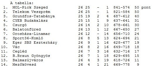 A szegediek ugyanúgy ötven ponttal - 25 győzelemmel és egy vereséggel - zártak, mint a Veszprém, de az egymás elleni összevetésben jobbak, mert hazai pályán 26-23-ra győztek, idegenben pedig 24-22-re kaptak ki.