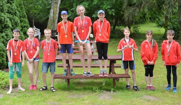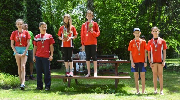 Teljes Veszprém megyei fölény született a középtávú versenyen a 14 éveseknél. A fotón - balról jobbra - Lantai Anna Boróka (2.), Gaál Csanád (2.), Bácskai Eszter (1.), Angyal Dániel (1.), Bálint Benedek (3.), és Papp Viktória (3.)